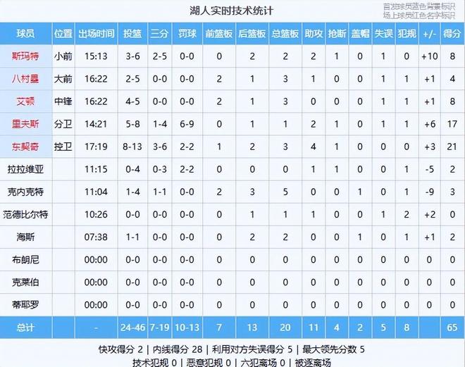 湖人:东契奇21分3板4助、里夫斯17分1板2助、斯玛特8分3板2助、艾顿8分3板、八村塁4分2板1助、克内克特3分5板、海斯2分2板、拉拉维亚2分1助、范德比尔特1板1助